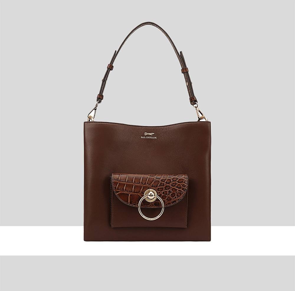 Stylish Paul Costelloe Manara shoulder bag in brown leather. Designed for practicality with a side zipped pocket and an outer pocket inside for essentials.