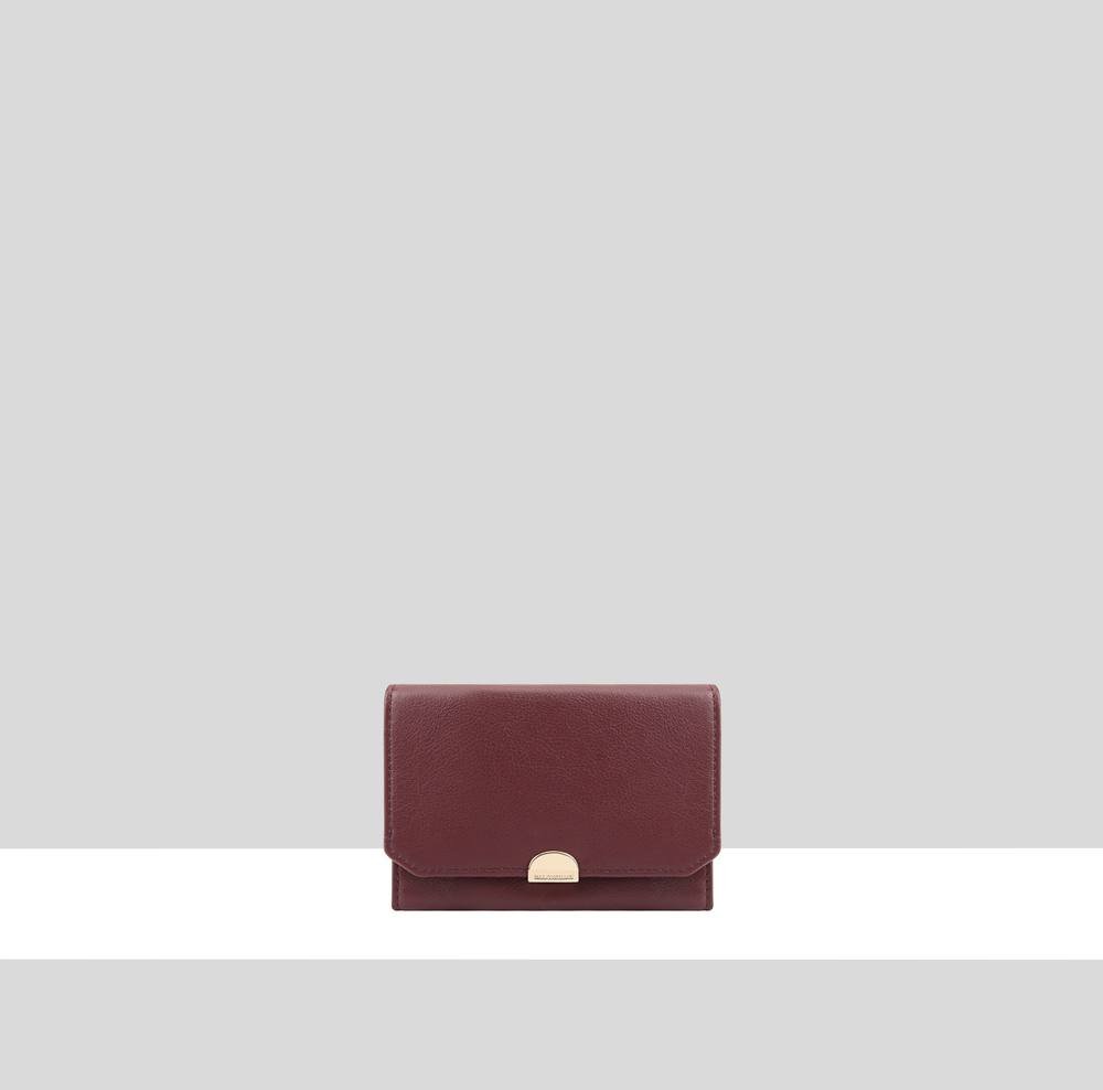 Compact leather card and note case in burgundy. Features dedicated sections for cards and notes, along with a separate zipped pocket for coins. Ideal for everyday and travel use.