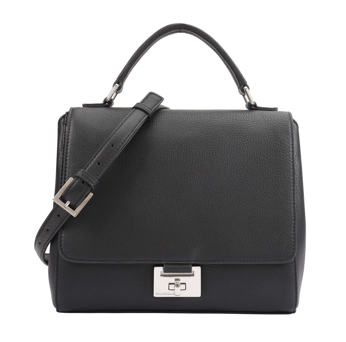 Stylish Paul Costelloe shoulder bag in jet black crafted from premium soft grainy leather. Features a long flap secured by a branded turn lock, multiple compartments, and a handy back slip pocket. Ideal for work essentials and gadgets.