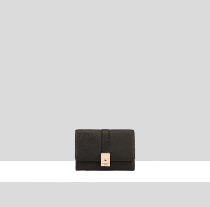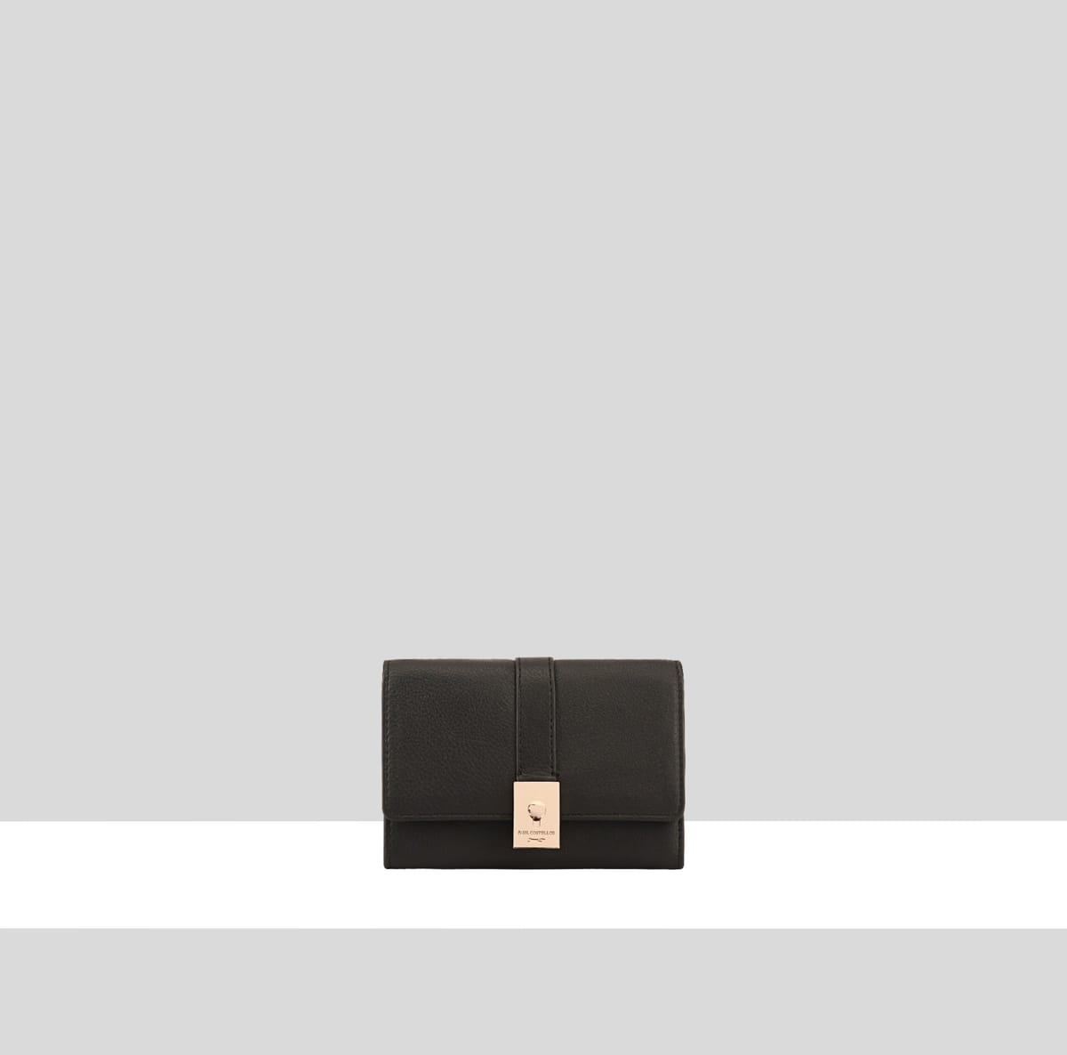 Compact leather flap-over purse designed for everyday convenience and style. Features a secure magnetic closure, twin compartments, and a central zip section. Perfect for keeping essentials neatly organised.