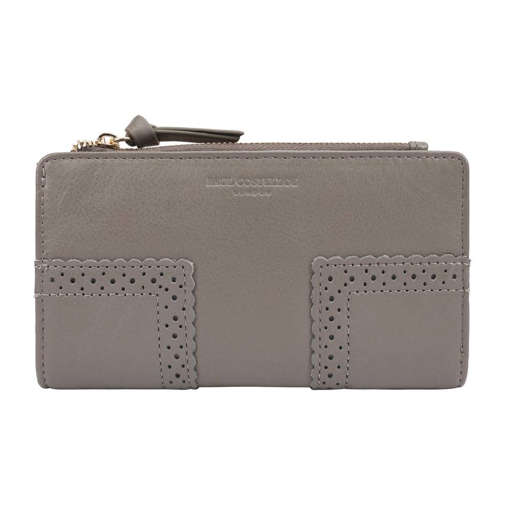 Compact Paul Costelloe Vita Purse in light grey crafted from soft grainy leather. Features separate card and note sections, a side zipped pocket for coins, keys, and small essentials. Secured with a popper, it is adorned with elegant perforated design details on the front and back corners, making it a stylish and practical accessory.