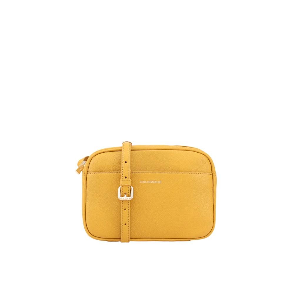 Chic Paul Costelloe Cooper crossbody bag in mustard leather. Sleek and versatile, it features a zip closure and adjustable strap for comfortable wear. Ideal for everyday elegance.