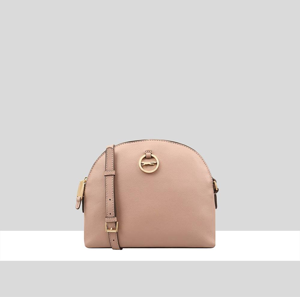 Stylish Pale Pink leather cross-body bag with a curved silhouette. Features a compact zipped compartment for essentials. Ideal for hands-free convenience.