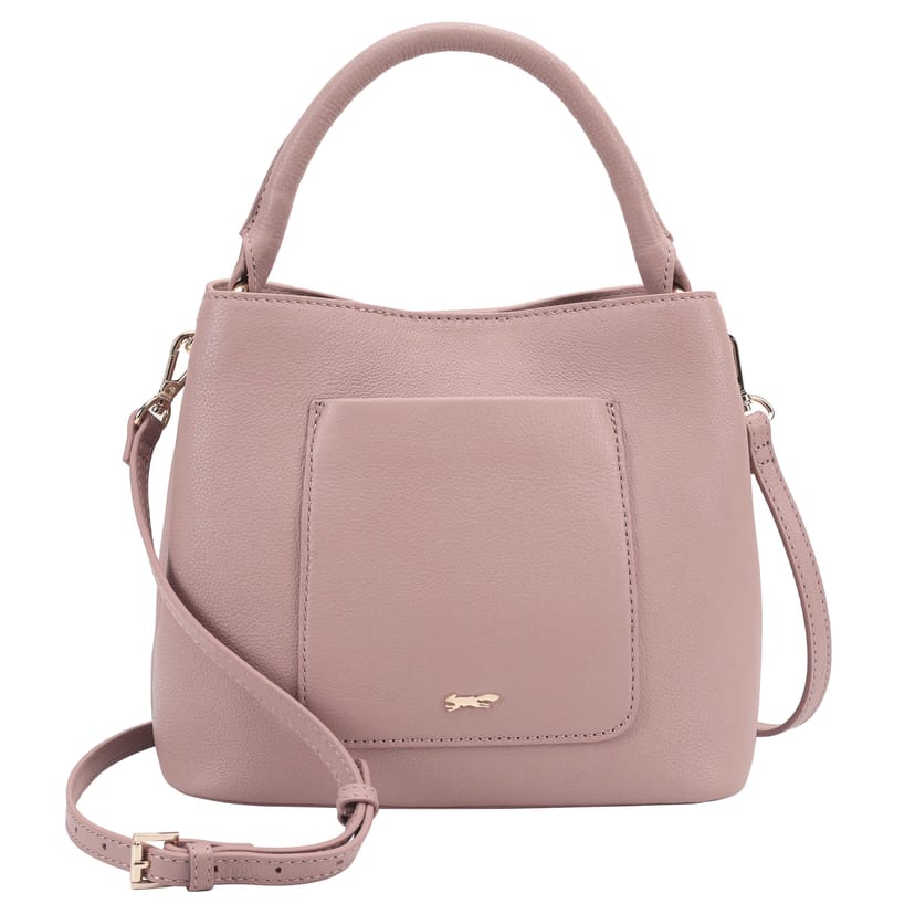 Stylish pink leather grab bag by Paul Costelloe. Features a sleek design with soft grab handles and a detachable, adjustable shoulder strap. The exterior includes a front slip pocket for quick access.