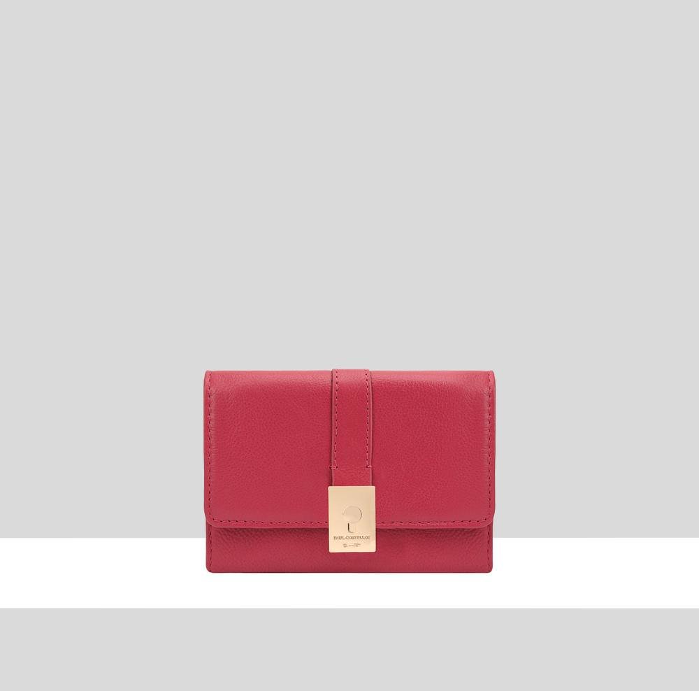 Compact and stylish, this pink leather flap-over purse by Paul Costelloe is designed for everyday convenience. It features a magnetic closure, twin compartments, and a central zip section to keep essentials organised. The separate card slots on either side of the internal add to its functionality.