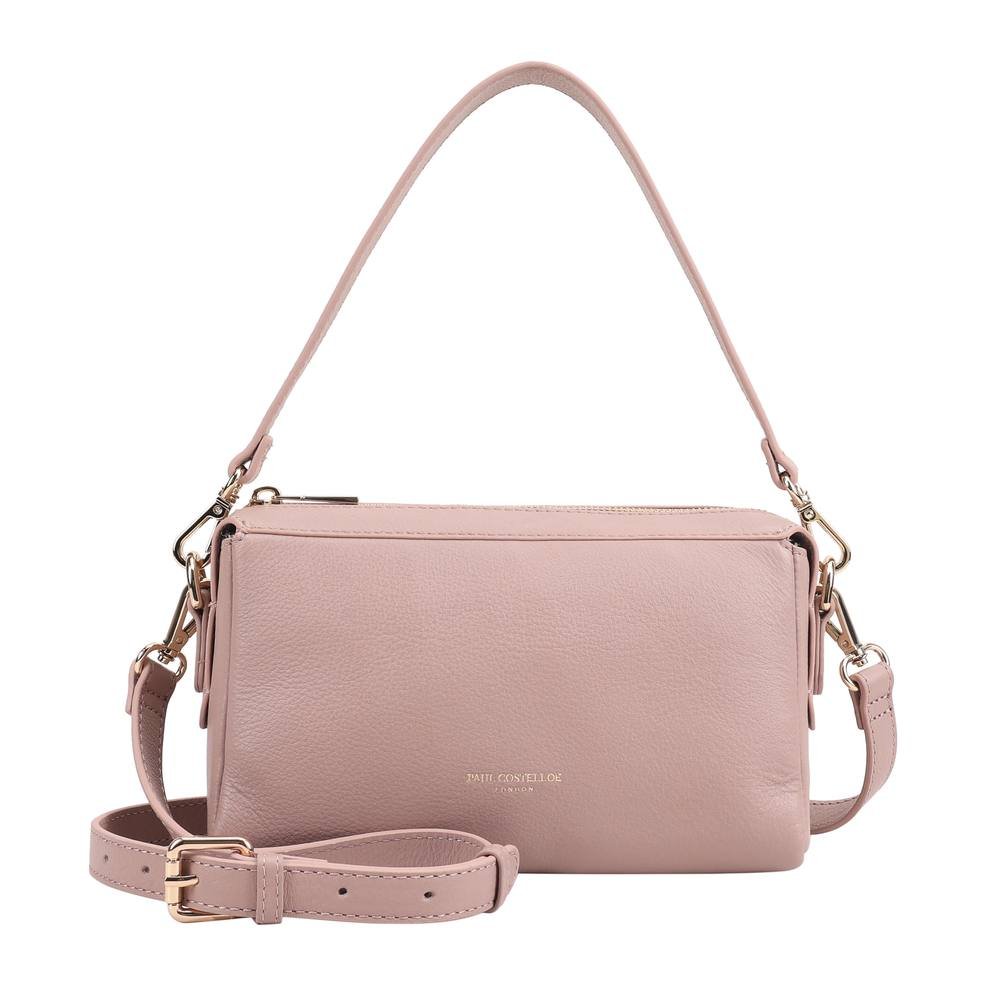 Stylish Paul Costelloe crossbody bag in rose leather. Features an adjustable strap, removable over-arm handle, and a secure zip closure. Ideal for everyday use with its well-organised interior.