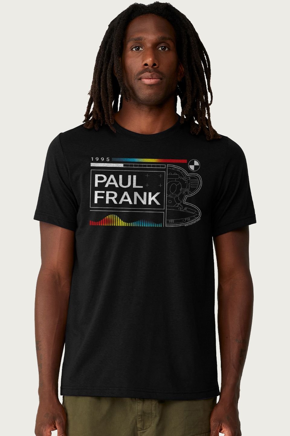 Officially licensed Paul Frank apparel. This black cotton t-shirt features a crew neck and a retro sci-fi graphic print. Perfect for casual wear, it combines comfort with a unique design.