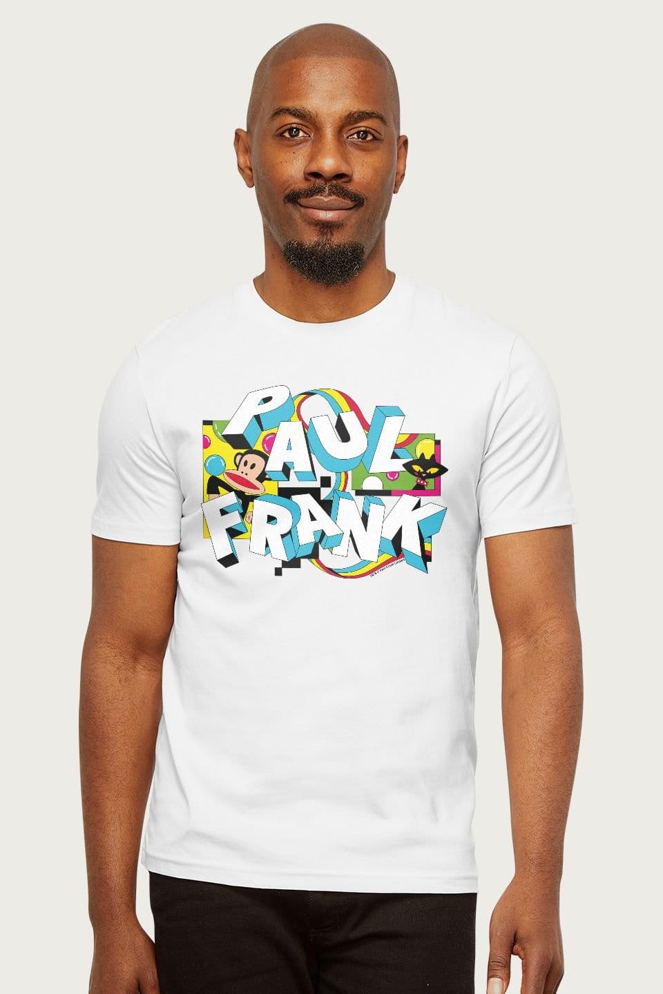 The Paul Frank Men's Julius & Mika Cat Chunky Text T-Shirt in White is available in sizes 2xl, l, m, s, xl.