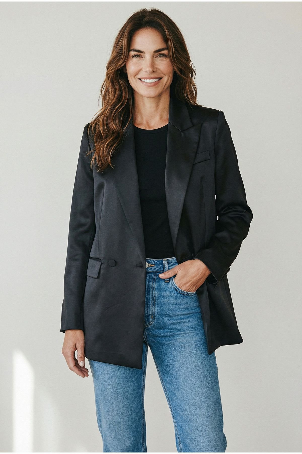 Elegant black satin blazer with an oversized fit for a modern, relaxed silhouette. Fully lined with structured shoulder pads, this piece is perfect for both professional and casual settings.