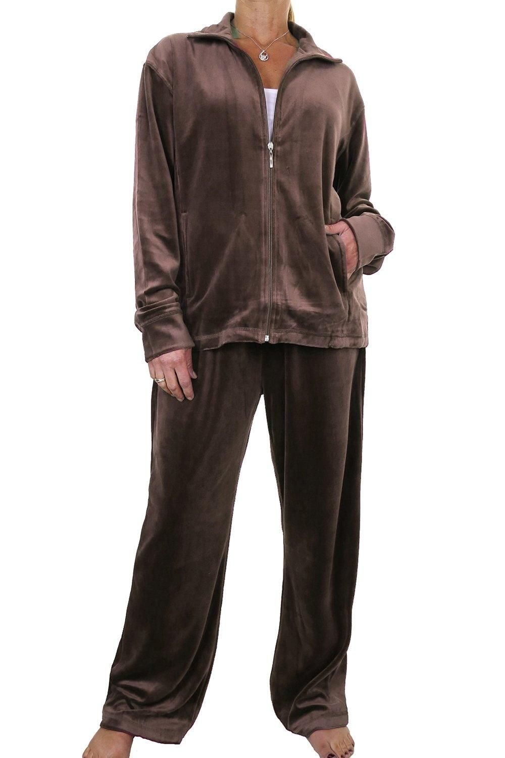 The Paulo Due Chocolate Velour 2 Piece Tracksuit is available in sizes 22-24.