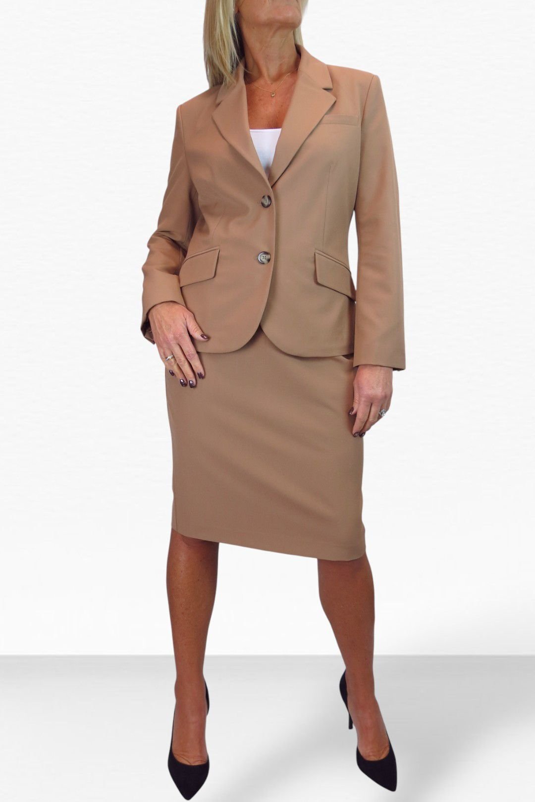 Stylish tan tailored skirt suit for women by Paulo Due. Made from a soft stretch suiting fabric, this 2-piece set includes a fully lined jacket with structured shoulder pads and a matching skirt. Ideal for professional settings.
