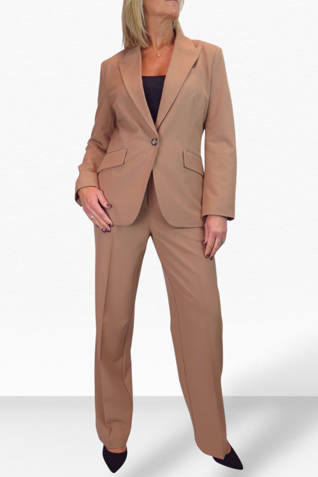 Stylish tan tailored trouser suit for women made from a soft stretch suiting fabric. The set includes a blazer with structured shoulder pads and a single large button, paired with matching trousers. Fully machine washable for easy care.