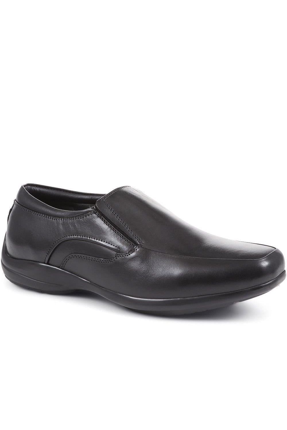 Classic wide fit leather slip-on shoes in black with a sleek, minimalist design. Crafted from high-quality leather for durability and style. Designed for extra comfort with a fully removable cushioned insole.