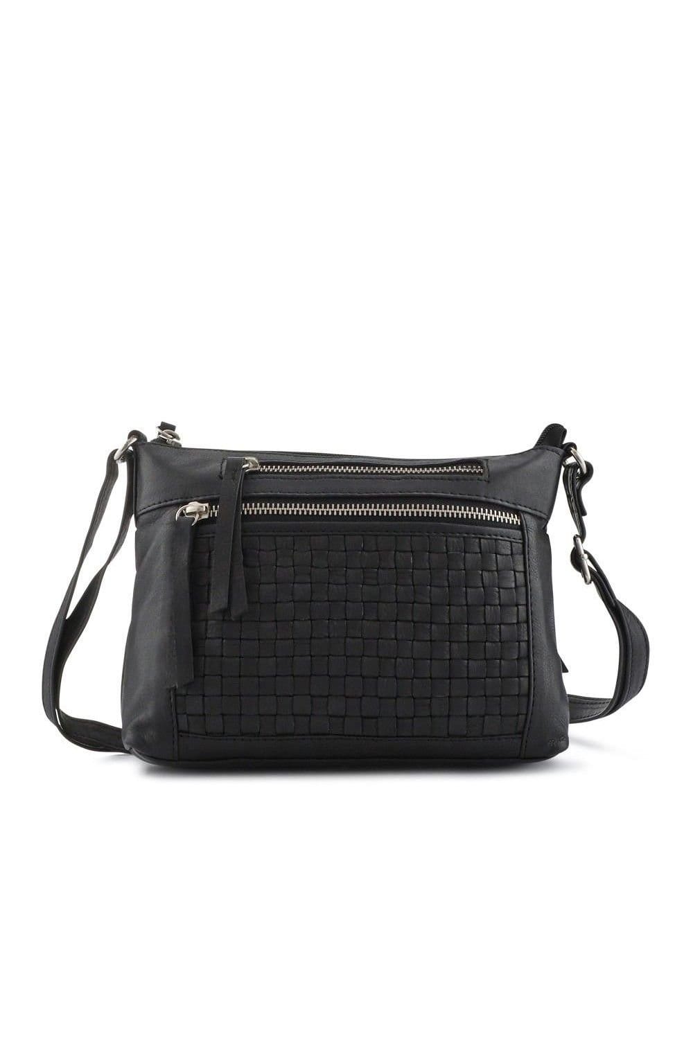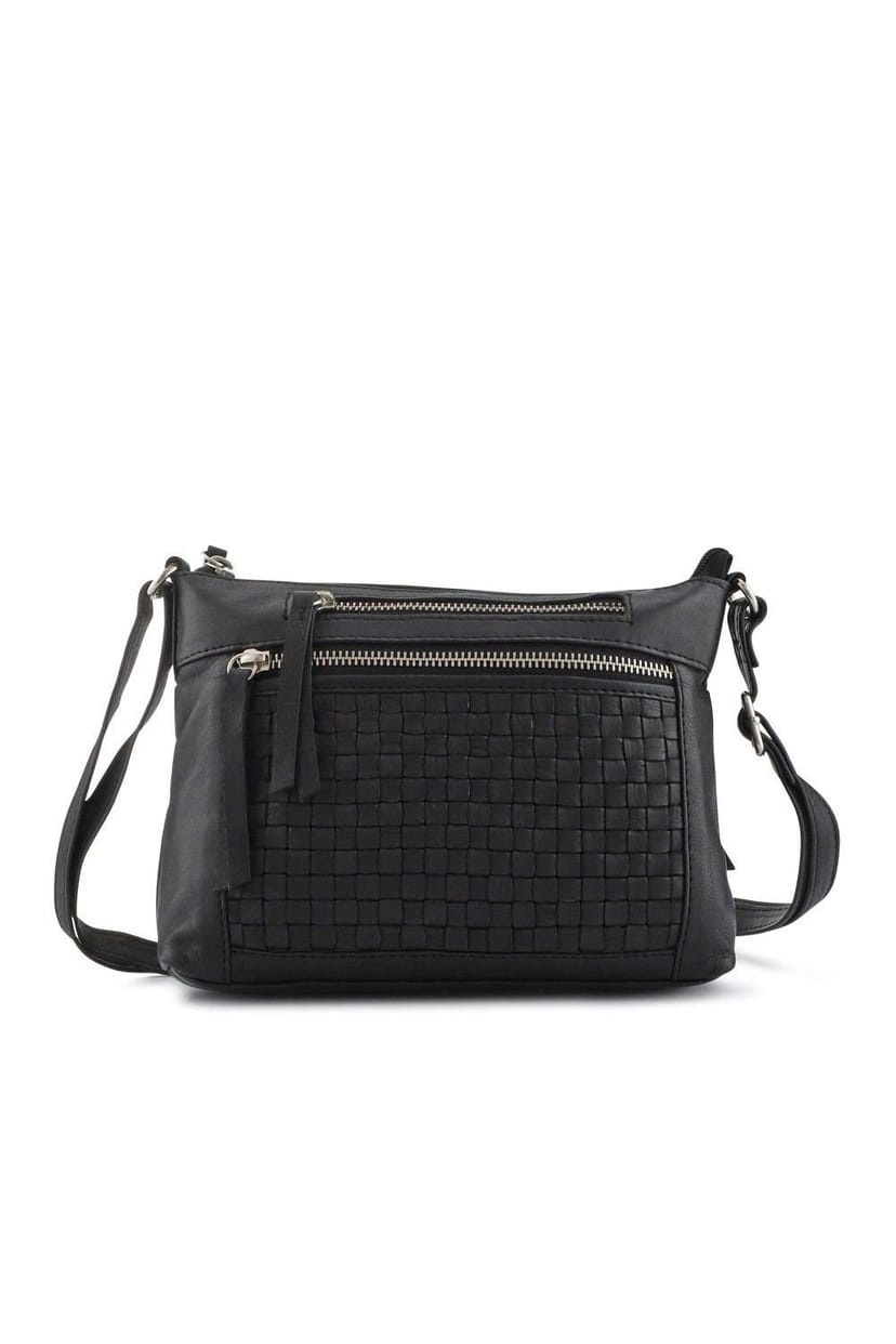 Stylish black leather crossbody bag with a textured woven pattern. Features multiple zippered pockets for organisation and an adjustable strap for versatile wear. Perfect for daily use and adding a smart touch to any outfit.