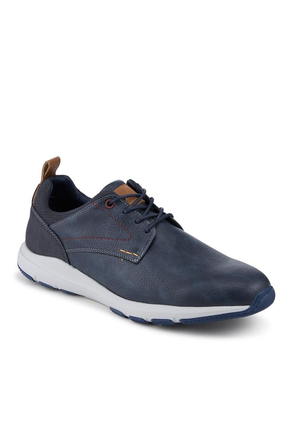 Casual and comfortable Navy leather trainers with a cushioned midsole and ergonomic outsole. The lace-up fastening ensures a secure fit, making them perfect for everyday wear.