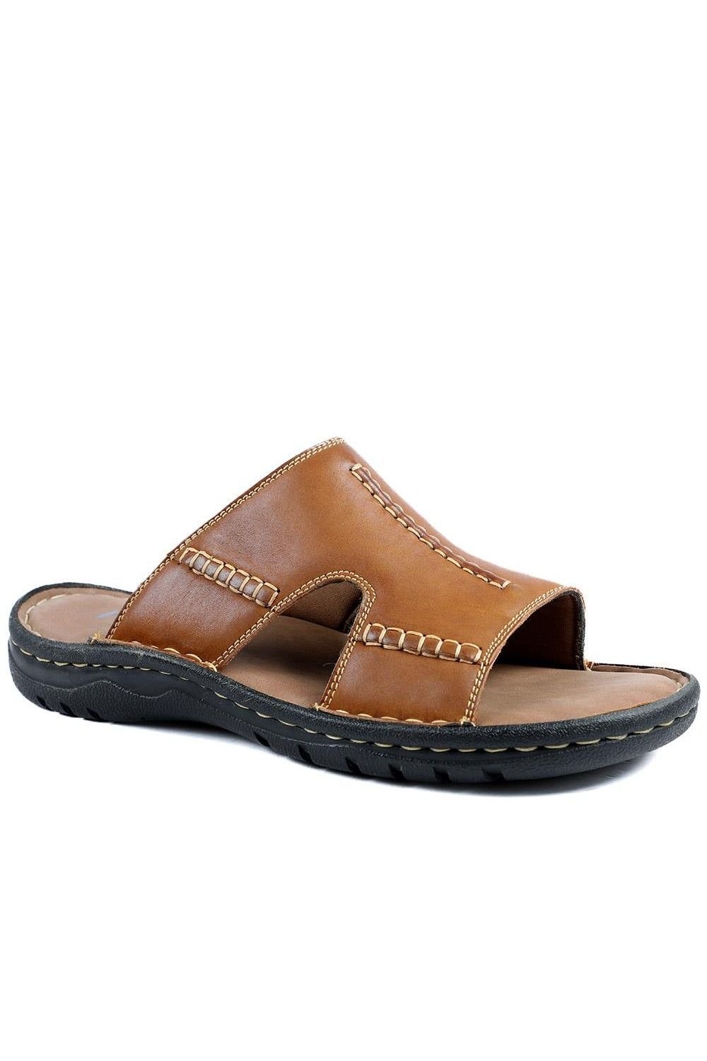 Comfortable men's slip-on mule sandals in tan leather. Designed for daily wear with a flat 2 cm heel and cushioned sole for all-day support. Perfect for relaxed, casual outings.