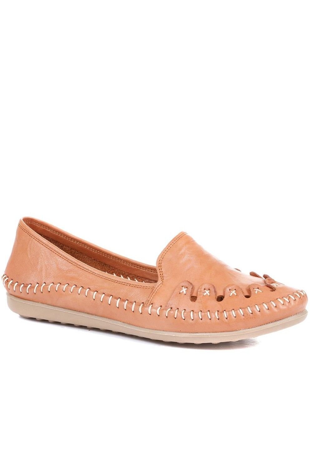 Beautifully crafted tan leather slip-on pumps with casual appeal, embellished with stunning cross stitching. Designed for sunny days, these shoes offer pure leather lining for luxe comfort and added flexibility.