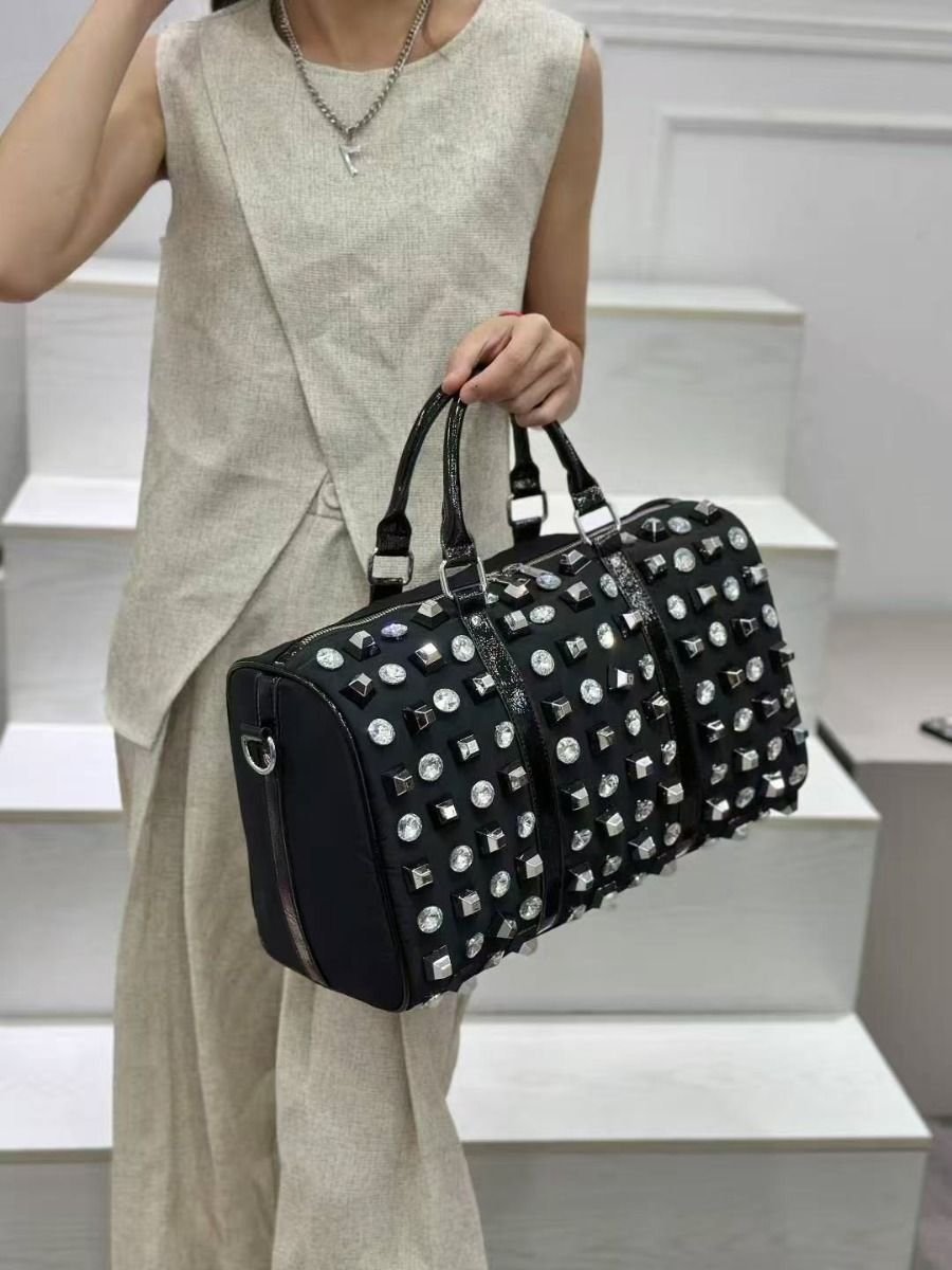 This stunning black duffle handbag is adorned with an array of sparkling crystals and edgy metallic studs, creating a captivating design that's sure to turn heads. Perfect for making a statement, whether you're heading out for the evening or adding a bold touch to your daily look.