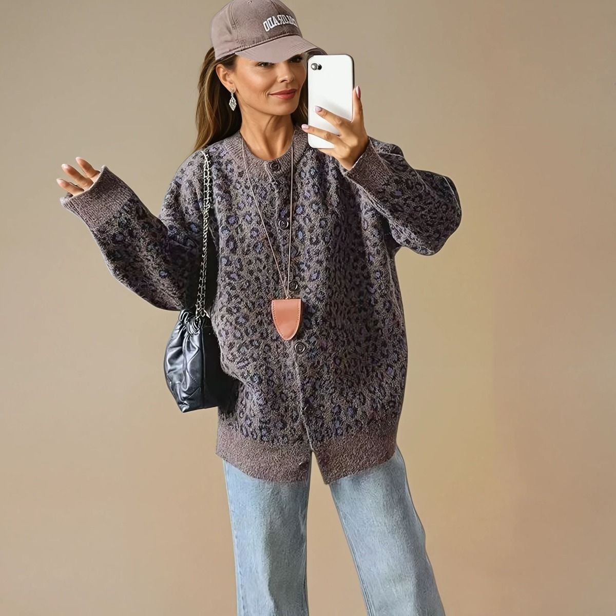 This oversized knit cardigan features a soft leopard print in a muted brown colour. Its relaxed fit and dropped shoulders make it perfect for layering over casual outfits. Ideal for cool-girl style.