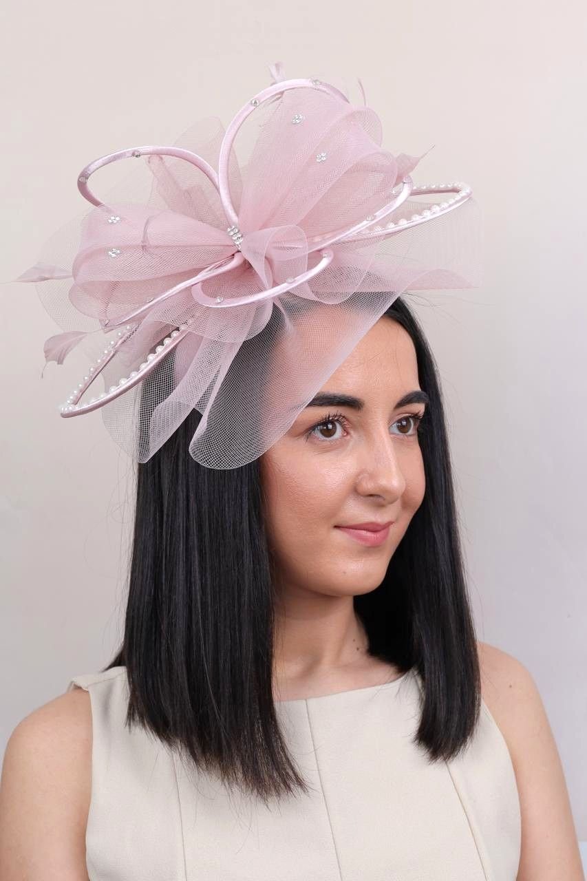 Elegant dusty pink fascinator with lush mesh loops and delicate feather flourishes. Adorned with a chic string of pearls and crystals, this headpiece is perfect for special occasions.
