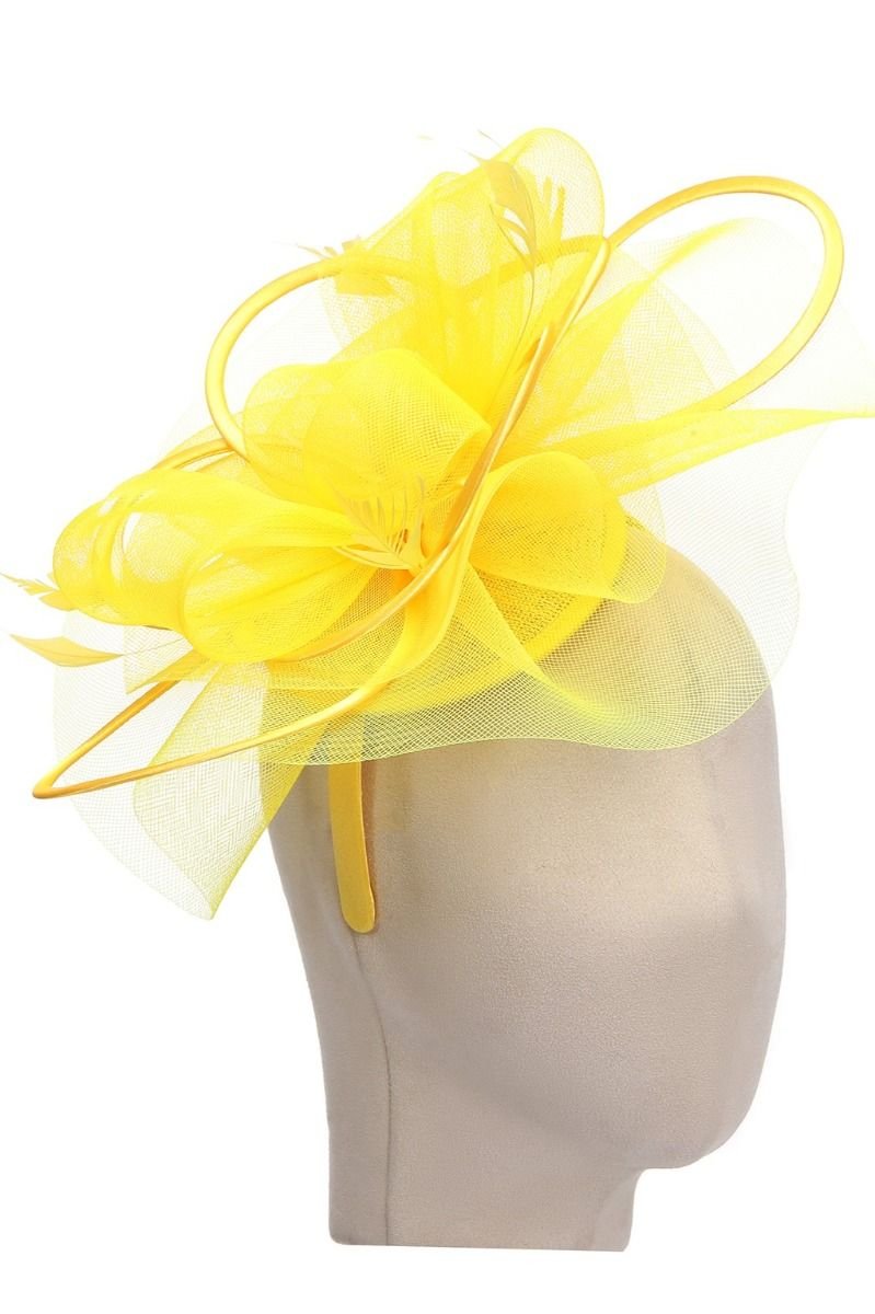 The PEACH ACCESSORIES Yellow Mesh Fascinator with Feather Accents is ideal for evening, party, wedding-guest.