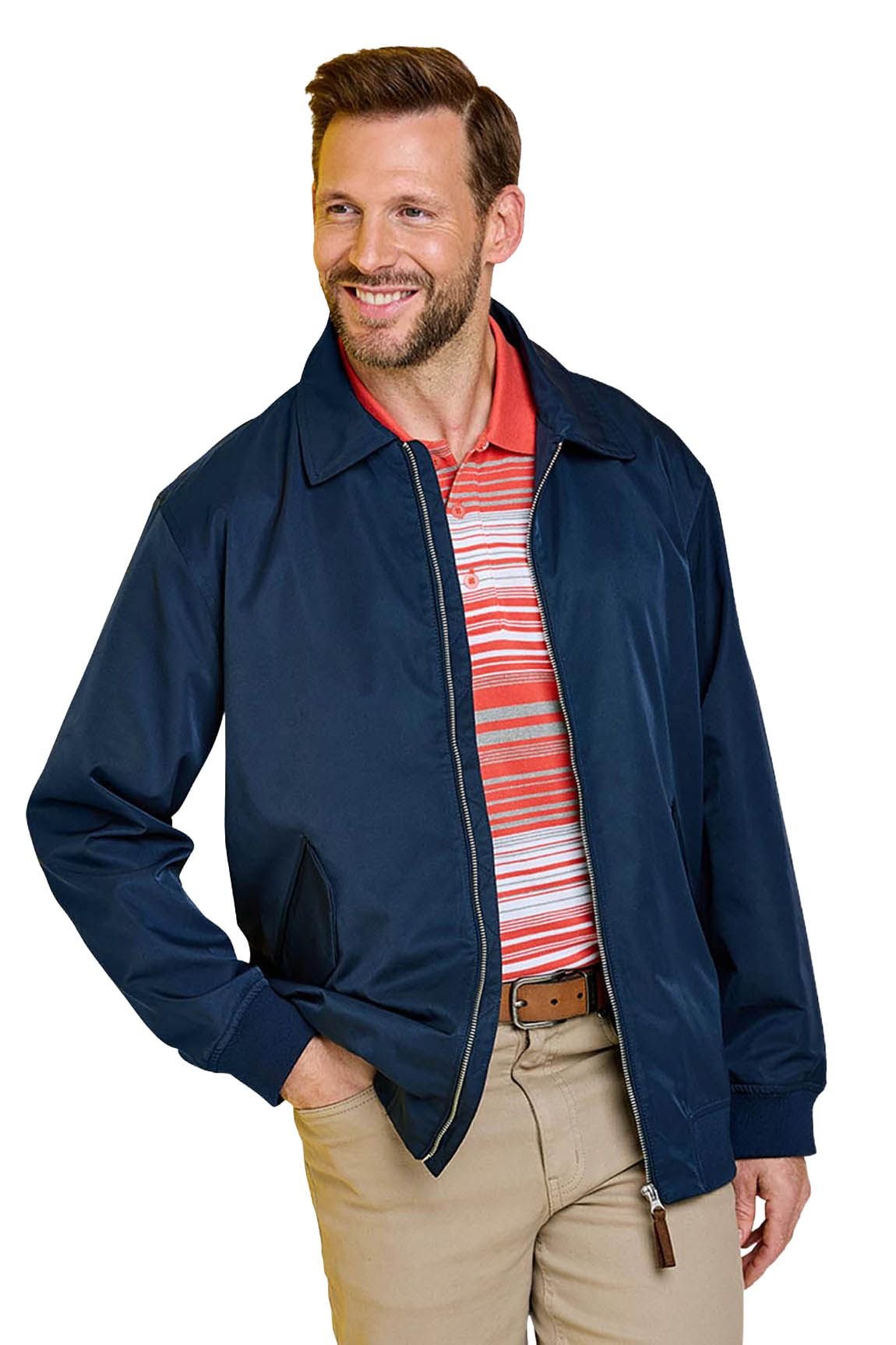 Stylish navy lightweight showerproof jacket crafted from water-resistant fabric. Features a full zip closure, elasticated cuffs and hem for a snug fit, and multiple pockets for practicality.
