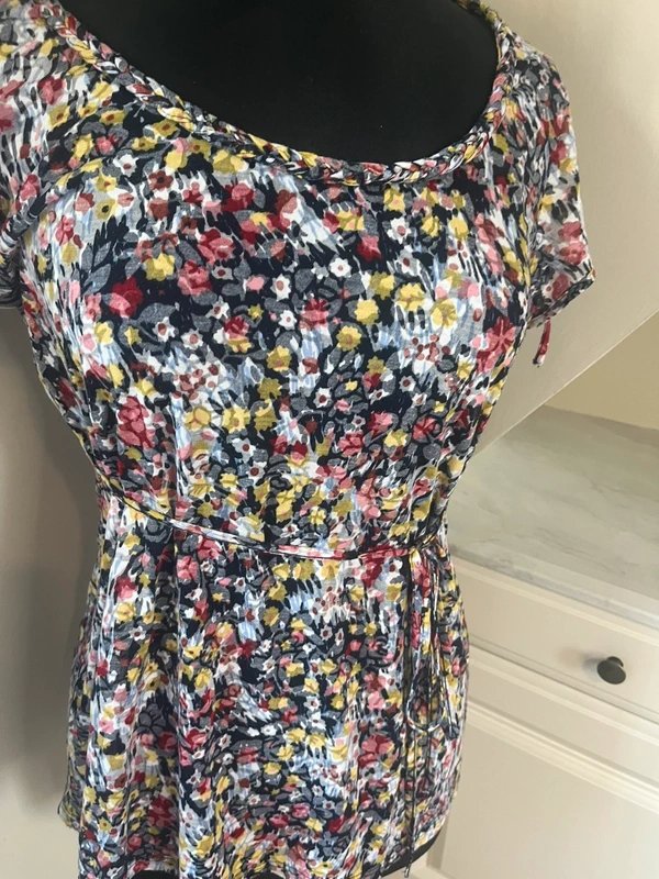 Adorned with a floral print, this camisole features a tie wrap waist and fringed hem for a stylish touch. The short sleeves and scoop neckline make it perfect for casual outings.