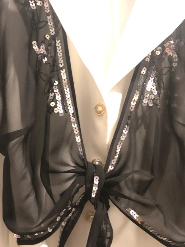 Adorned with silver sequin edges and front floral sequins and beads embroidery, this black vest by Per Una features a tied waist for a flattering fit. Perfect for evening outings, it's a lovely addition to any outfit for all seasons.