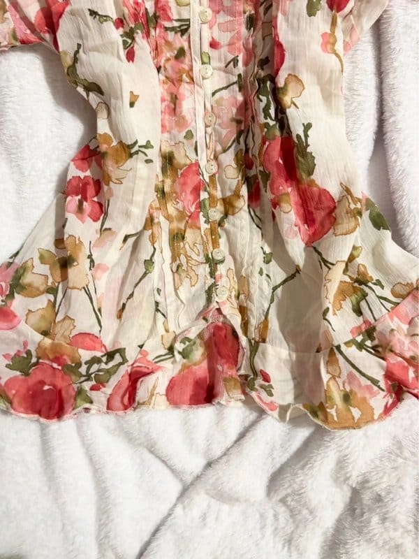 The Per Una Cream and Pink Floral Button-Up Shirt with Ruffle Hem is available in sizes S.