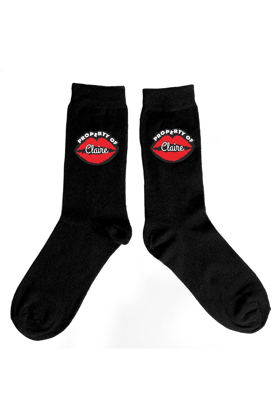 Personalised men's socks in black with a fun Property of Claire print. Made from a comfortable cotton/polyester/elastane blend.