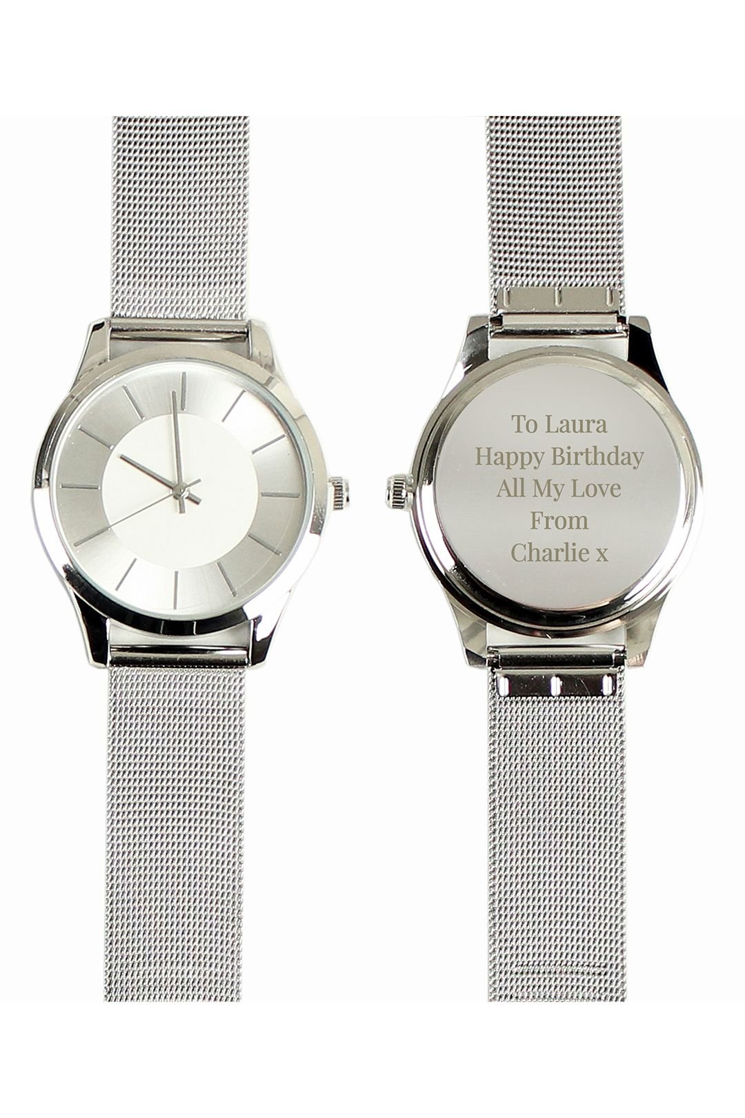 Stylish Personalised Memento Company men's watch with a mesh style strap and metallic silver finish. Features a personalisable back for a special touch.