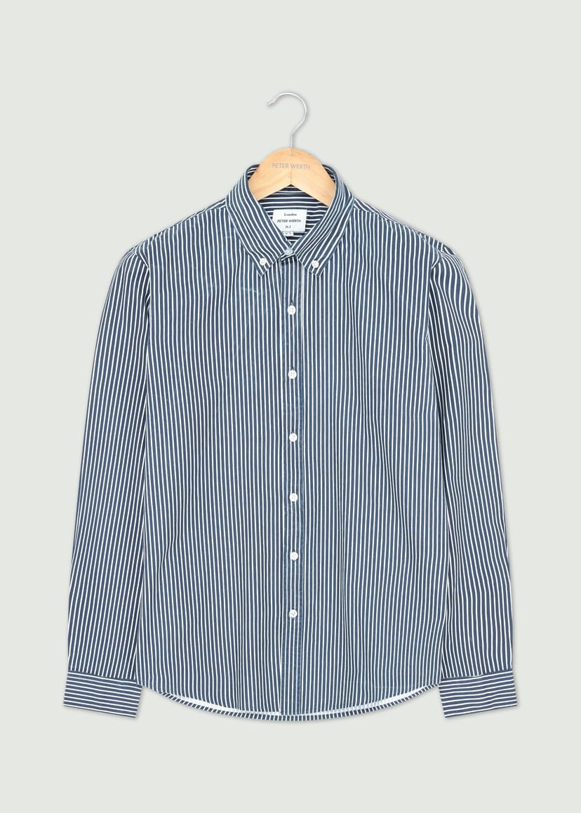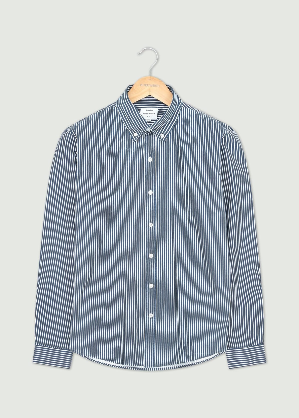 The Peter Werth Navy & White Striped Long Sleeve Shirt is available in sizes L, M, S.