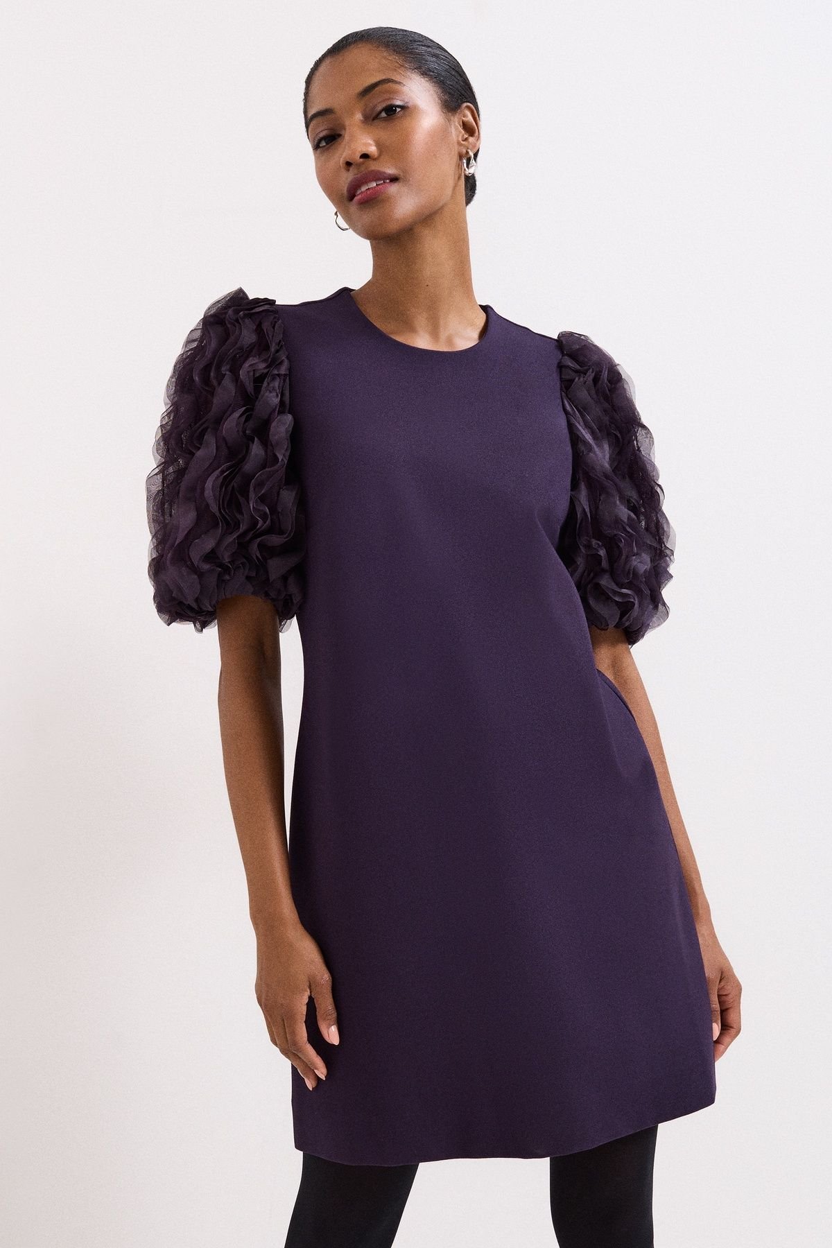 The Phase Eight Aubergine Puff Sleeve Mini Dress is available in sizes 10, 12, 14, 16, 18, 20, 22, 24.