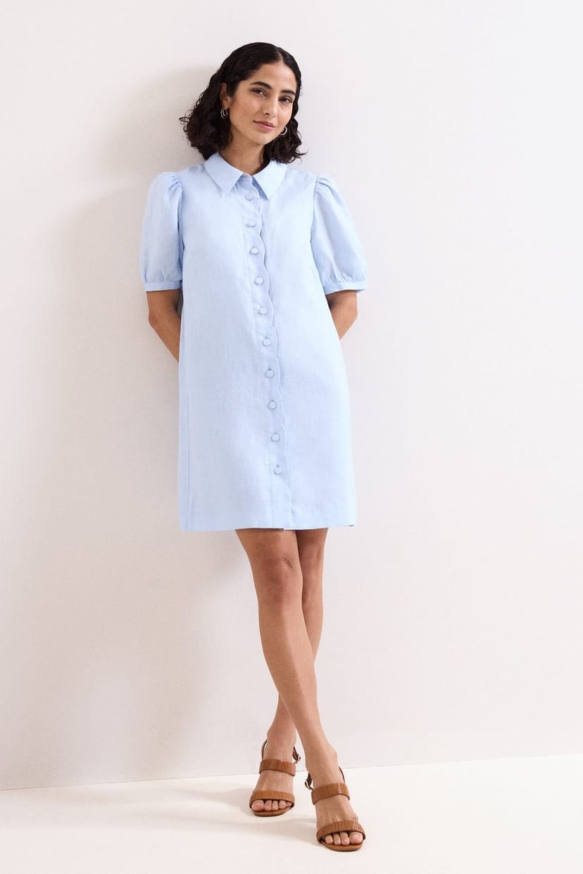 This baby blue linen dress features a soft A-line silhouette, a scalloped button placket, and sculpted puff sleeves. Ideal for sunlit weekends and relaxed city afternoons.