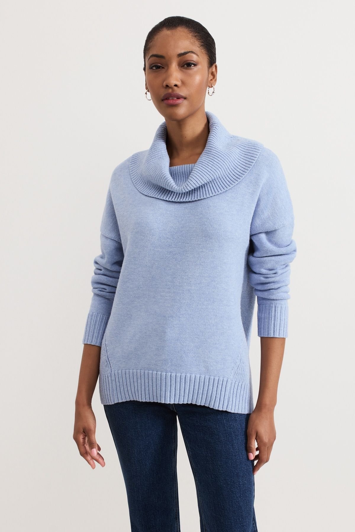 This baby blue chunky jumper by Phase Eight features a cowl neckline and ribbed detailing at the neck, cuffs, and back for a cosy, elevated style. Ideal for pairing with trousers or jeans.