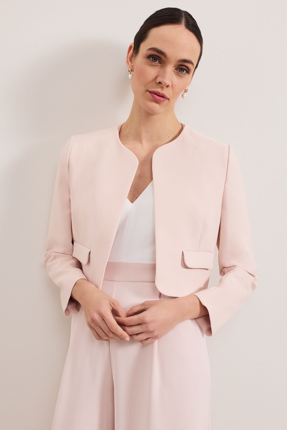 View Debenhams's returns policyThis baby pink tailored jacket by Phase Eight features clean lines and a silky drape, perfect for occasionwear and evening looks. The cropped length and waist-sculpting design add a touch of elegance.