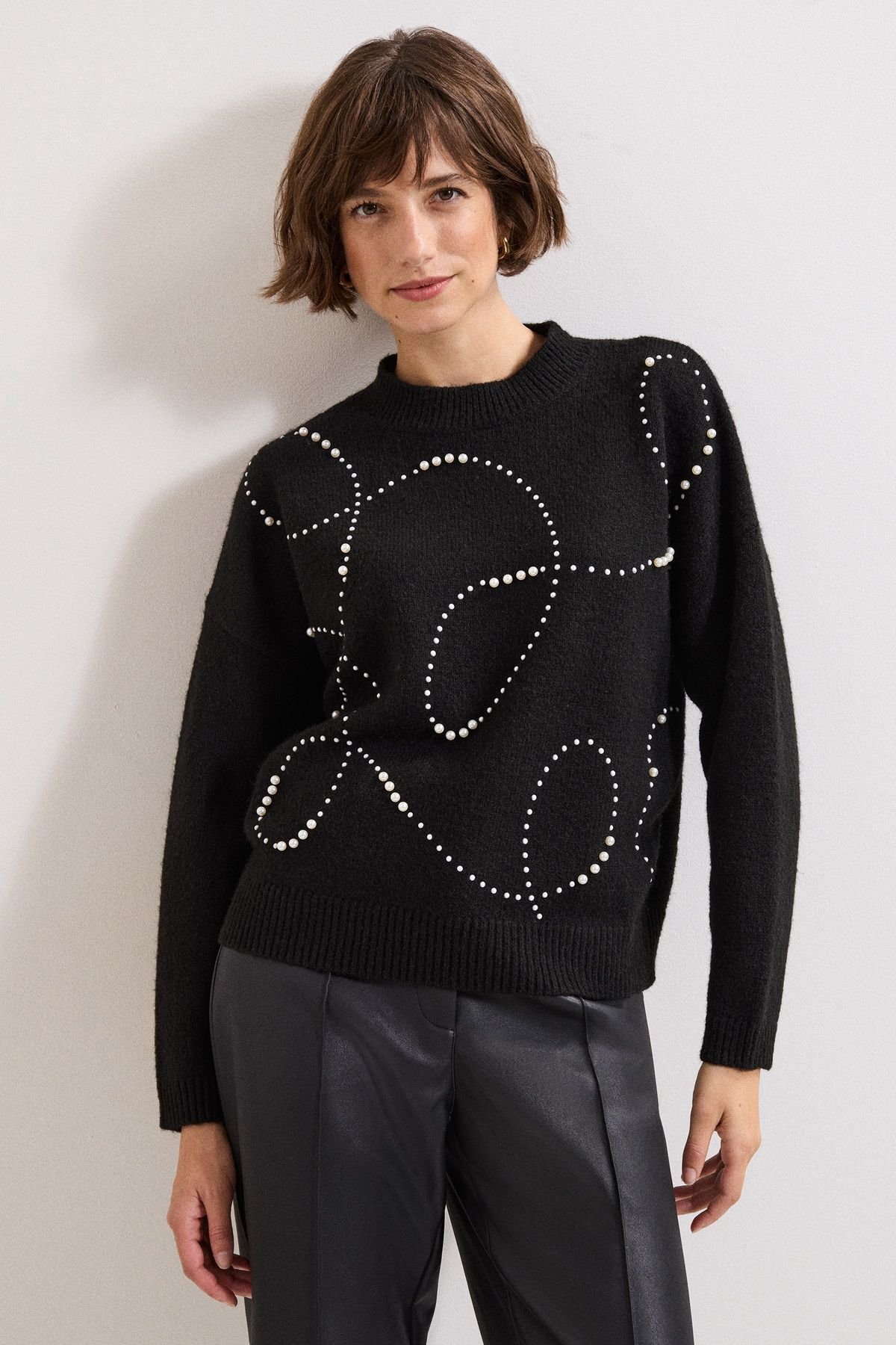 Elegant black embellished crew neck sweater by Phase Eight. Features a chunky knit texture and geometric pearl-like embellishments. Perfect for a casual yet stylish look.