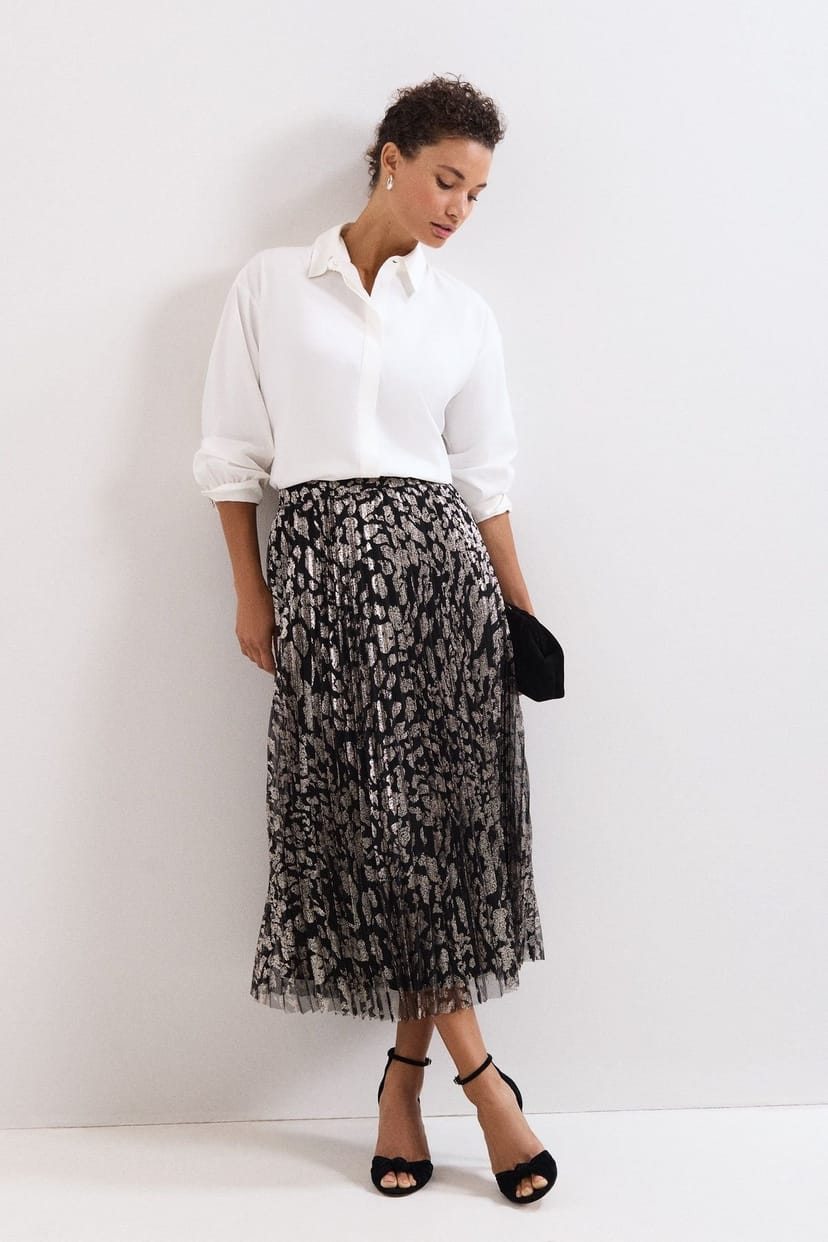 Elegant pleated midi skirt in black with a sparkly metallic print. Features an elasticated waist for comfort and a flattering drape. Ideal for evening events or special occasions.