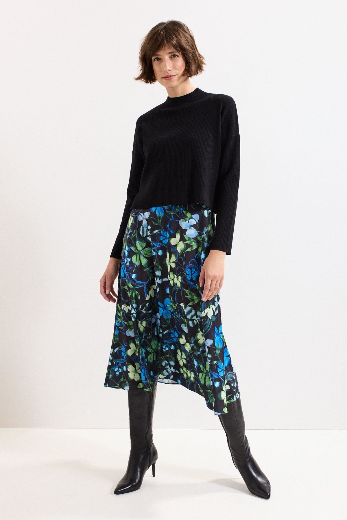 Versatile midi dress in black with a classic top and a contrasting floral satin skirt. Perfect for a sophisticated feminine style, wear with the jumper or on its own.