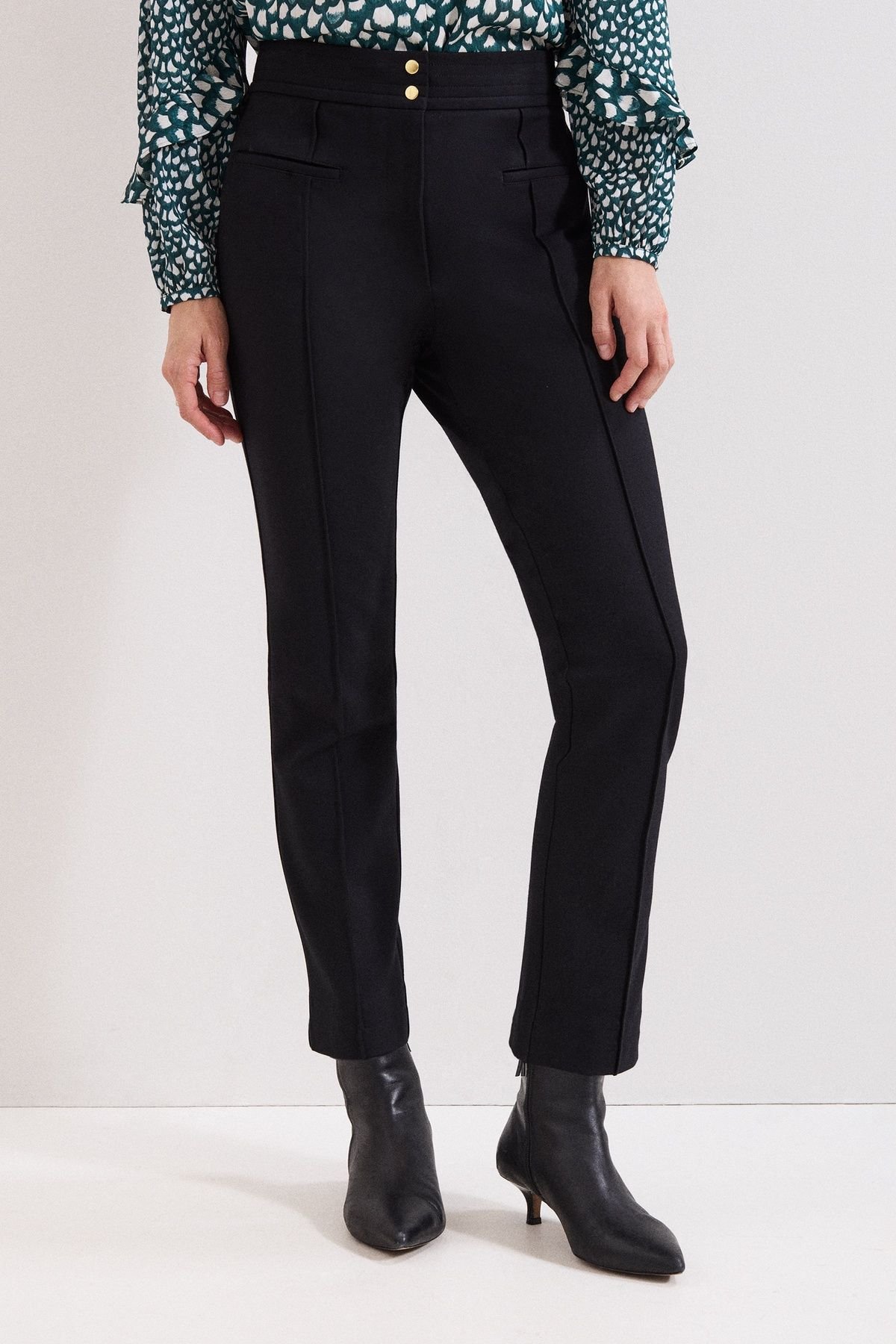 Stylish black stretch trousers by Phase Eight. Designed for comfort and style, featuring a straight-leg silhouette and gold popper fastening. Ideal for versatile day-to-night wear.
