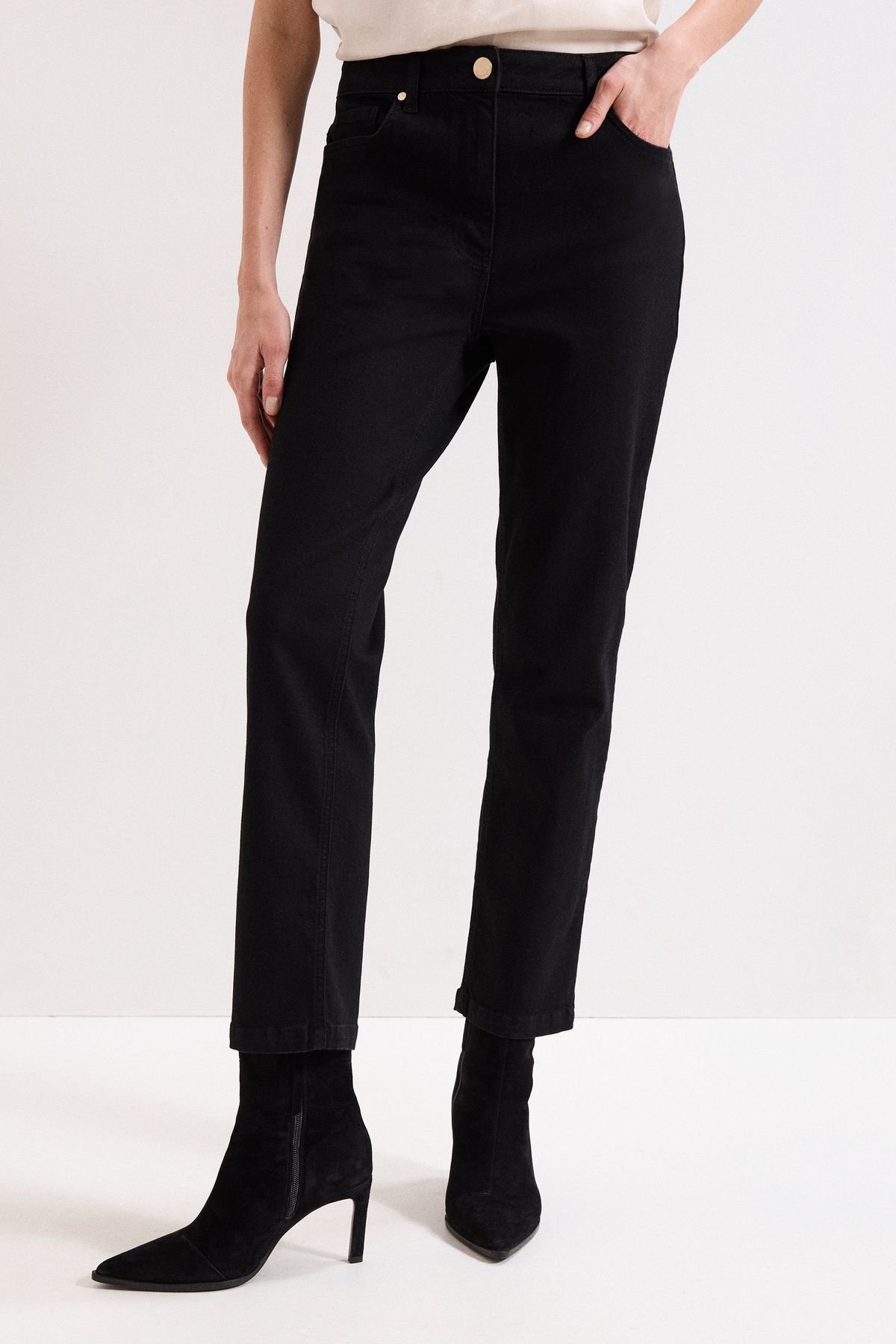 Stylish black slim-fit jean by Phase Eight. Made from a cotton-rich blend for comfort and subtle stretch. Features a high waist with a gold button, tapered legs for a tailored look. Perfect for versatile wear from casual to evening.