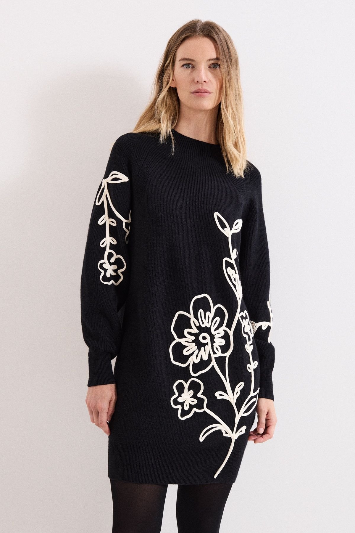 Stylish black jumper dress with a relaxed fit and mini length. Features a contrasting white floral design for a feminine touch. Perfect for casual or semi-formal occasions.