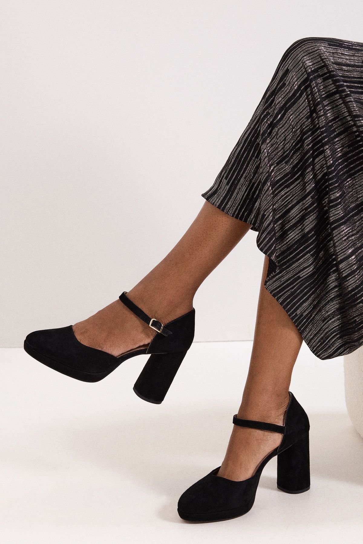 Timeless black suede heels with a block platform and rounded toe. Features an ankle strap for a refined look. Perfect for adding instant polish to your event outfits.