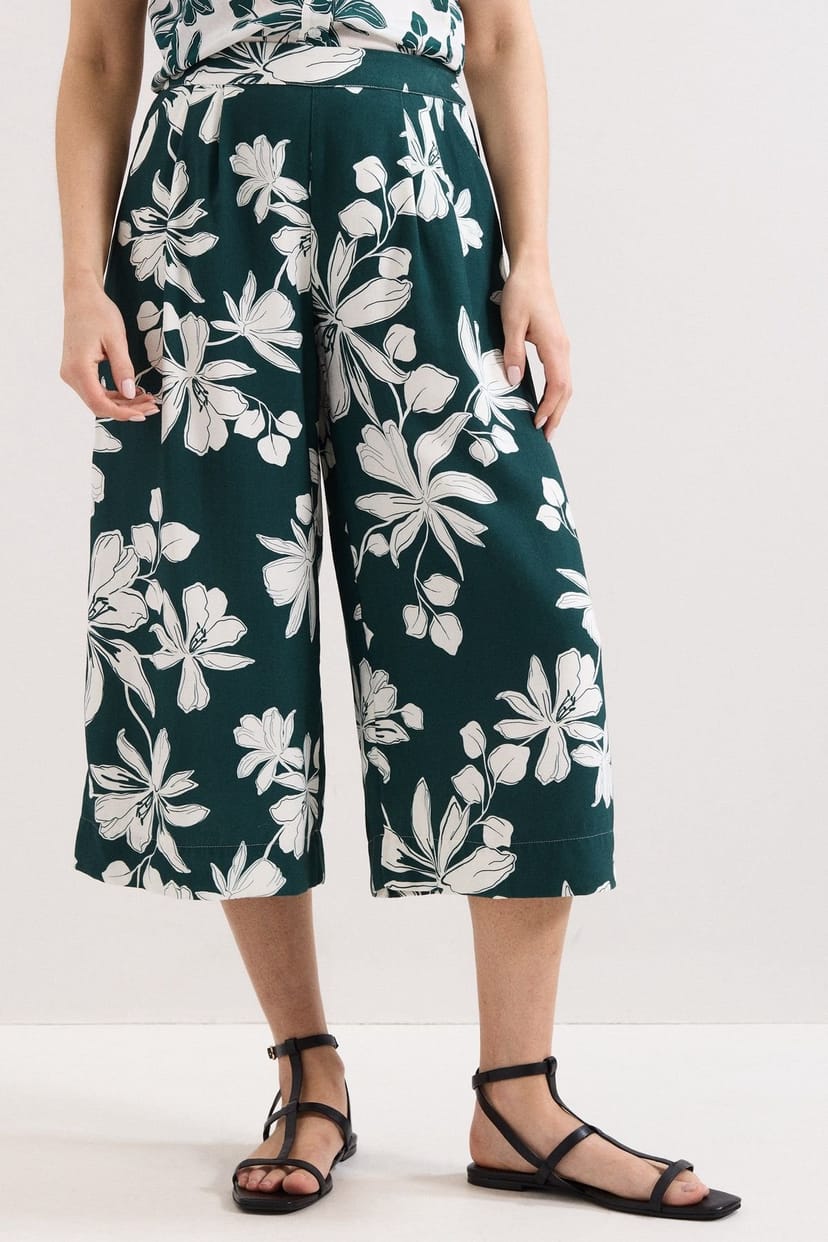 Stylish Phase Eight Josie Culotte Crop Trousers in Bottle Green with a floral print. These high-waist culottes offer a fluid wide-leg silhouette and soft drape for relaxed confidence.