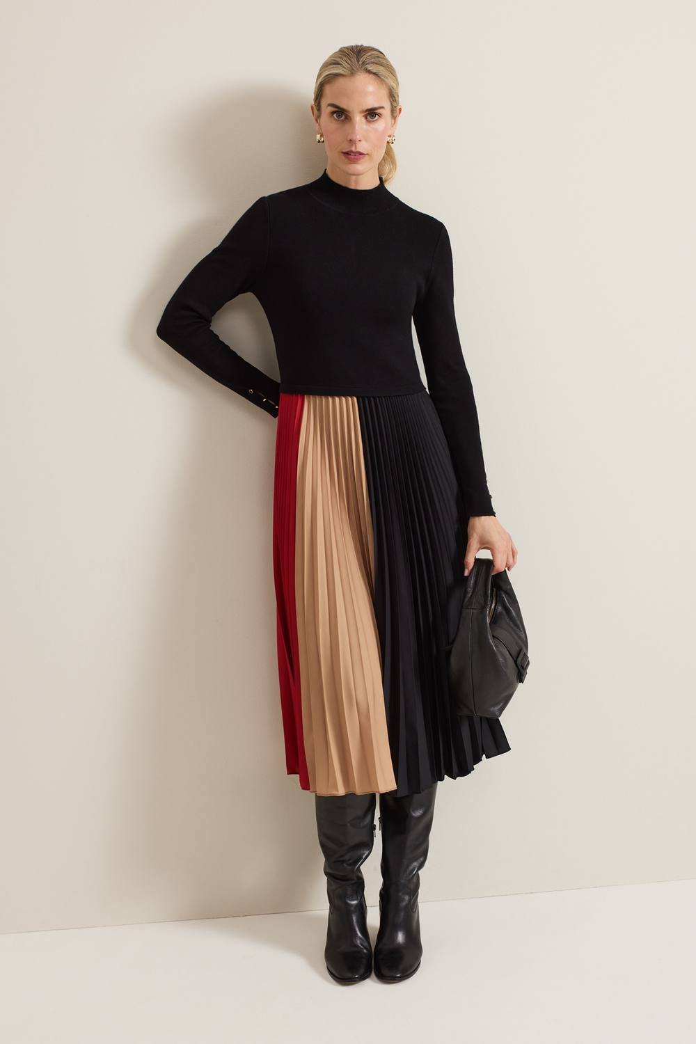 Stylish midi dress with a knitted top and pleated skirt. Features a colourblock design in black, red, and beige. Ideal for versatile styling from work to weekend.
