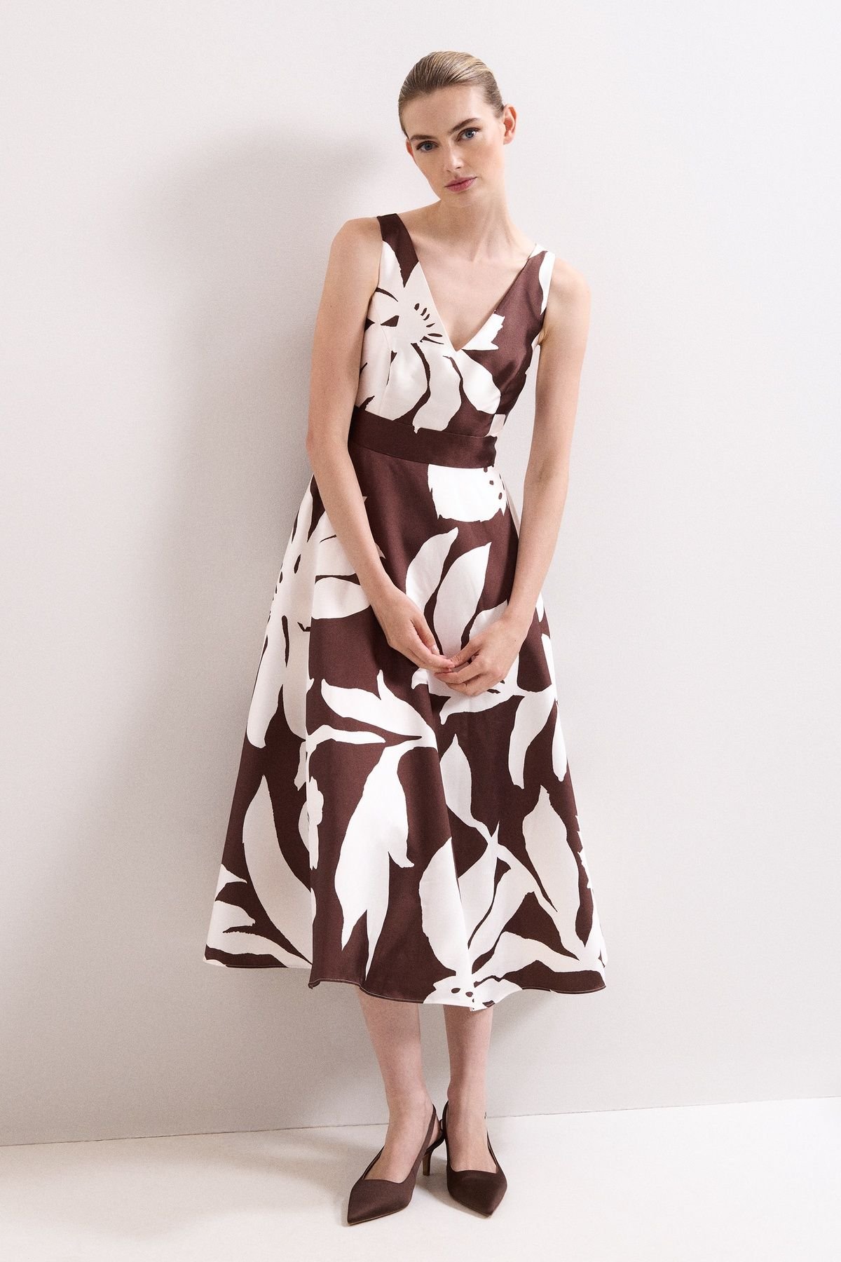 This Phase Eight dress features a bold, abstract floral print in rich chocolate and ivory shades. The V-neckline and sleeveless bodice are complemented by a full-bodied maxi skirt that adds volume and fluid movement. Ideal for weddings and special occasions.