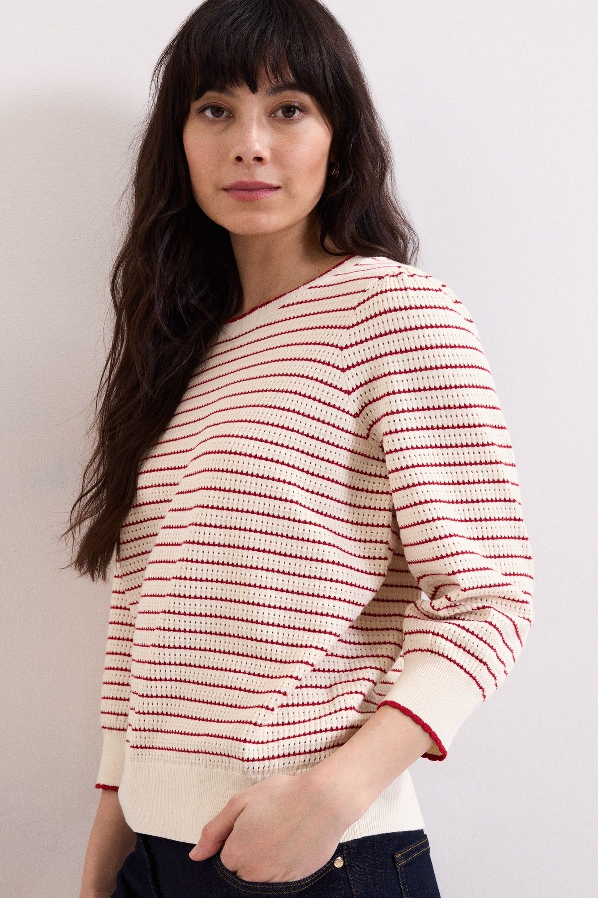 This airy open-knit jumper features a softly structured boat neck and relaxed three-quarter sleeves. The cream and red striped pattern adds a touch of style, perfect for weekend escapes and carefree city layering.