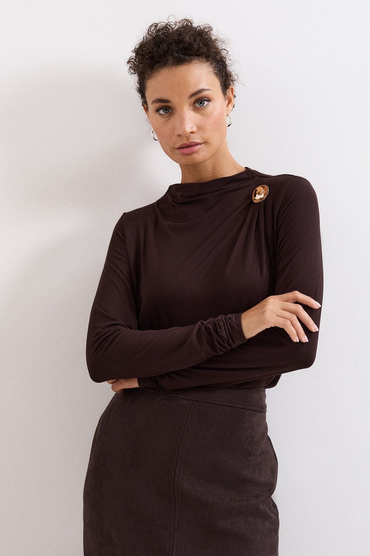 Stylish long-sleeve top in dark brown with a contemporary high neckline and statement draping. Designed for an understated evening look, this top features a luxe hardware detail on the shoulder.