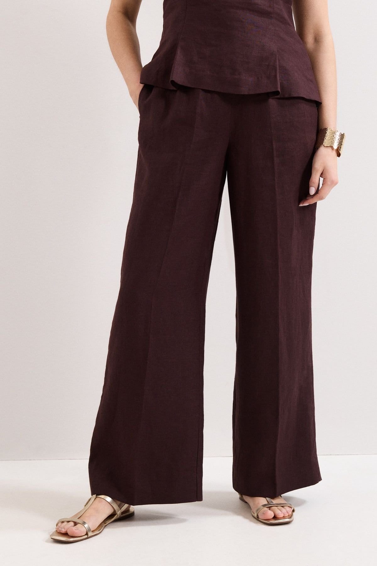 Stylish wide-leg trousers in dark brown linen offering a breathable and comfortable fit. The mid-rise silhouette flatters and flows from day to evening.