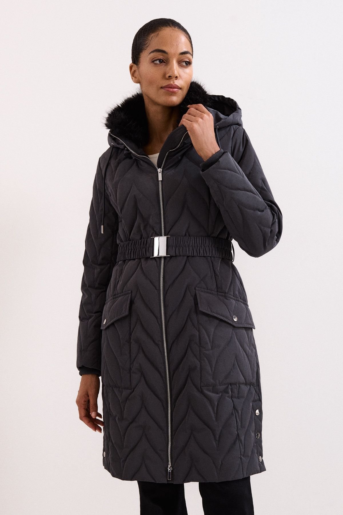 Stylish dark grey puffer coat by Phase Eight. Features a quilted herringbone pattern, detachable fur hood, and elasticated cuffs. Ideal for winter with its adjustable belt and large pockets.